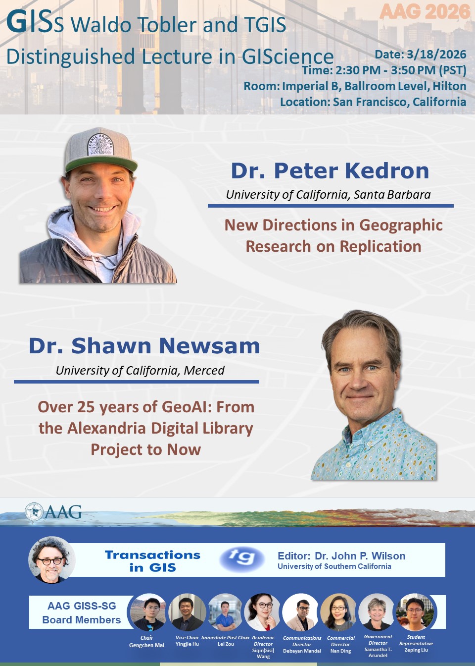 The AAG GISS Specialty Group and Transactions in GIS are thrilled to announce the speakers for the 2026 Waldo Tobler and TGIS Distinguished Lecture in GIScience!